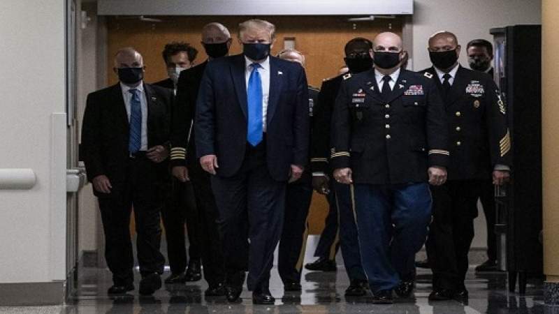 ترامب ولأول مرة يظهر أمام الإعلام مرتدياً كمامة منقوشة بالذهب