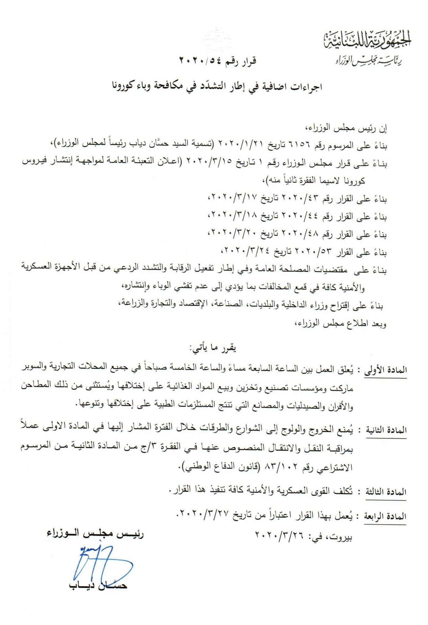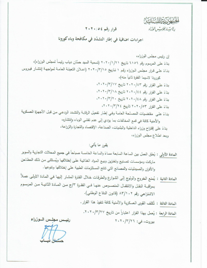أصدر رئيس مجلس الوزراء د. حسان دياب القرار ٢٠٢٠/٥٤ ويتضمن إجراءات إضافية في إطار التشدد في مكافحة وباء كورونا، يقضي، بالإقفال التام من الساعة السابعة مساء كل يوم حتى الخامسة صباحا مع بعض الاستثناءات الضرورية، اضافة الى منع الخروج الى الطرقات خلال الوقت المشار اليه.