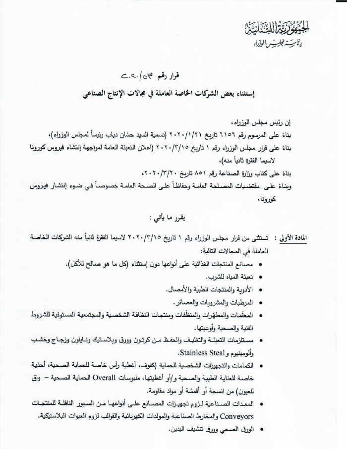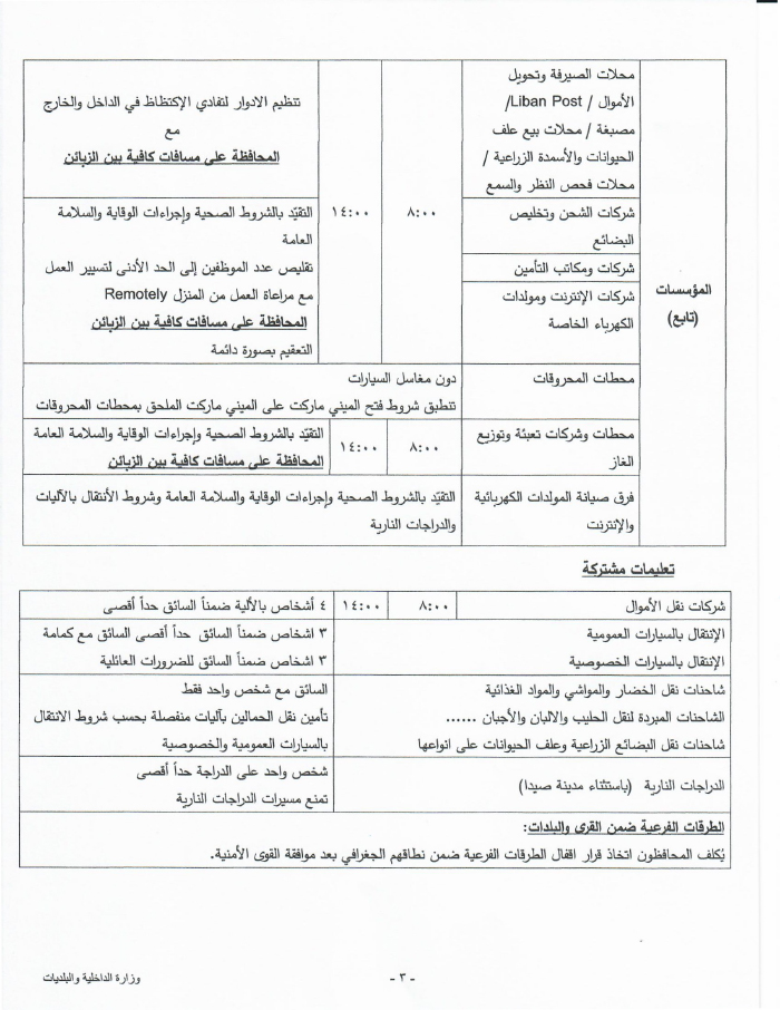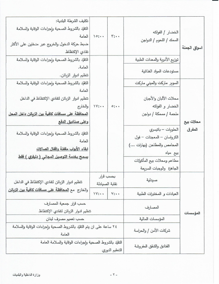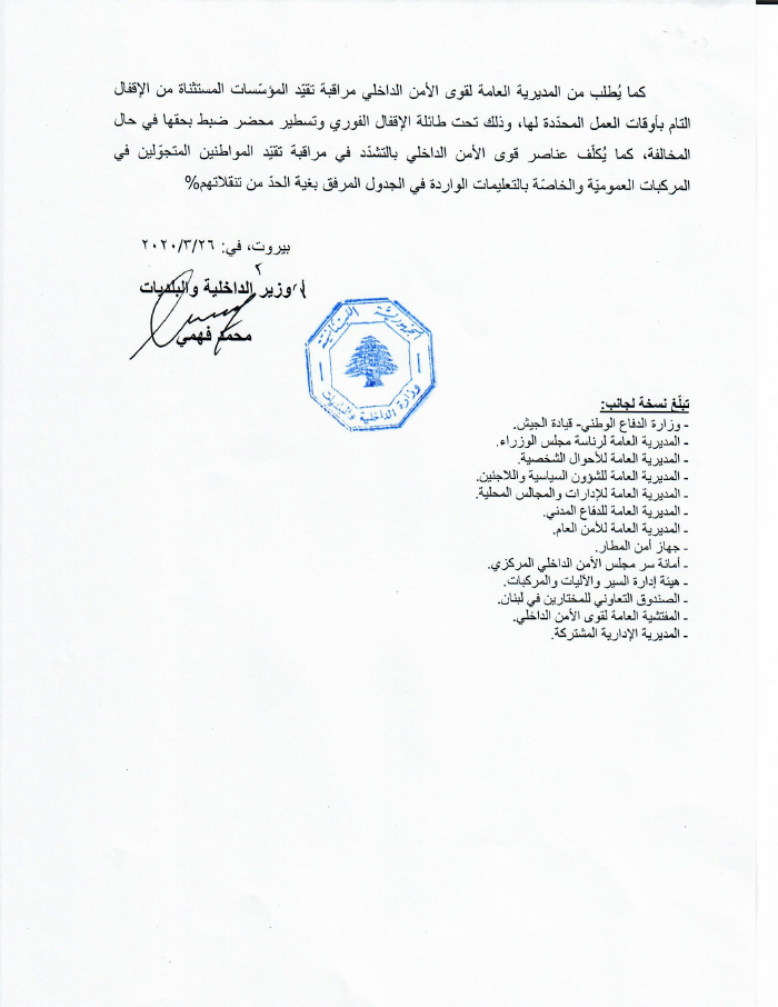 - أطلع دولة الرئيس مجلس الوزراء، على الإجراءات الإضافية الواجبة لضبط حركة التنقل والانتقال، والتي تقضي بالإقفال من الساعة السابعة مساء كل يوم حتى الخامسة صباحا مع بعض الاستثناءات الضرورية وذلك وفقا لقرار سيصدر عن دولة الرئيس.