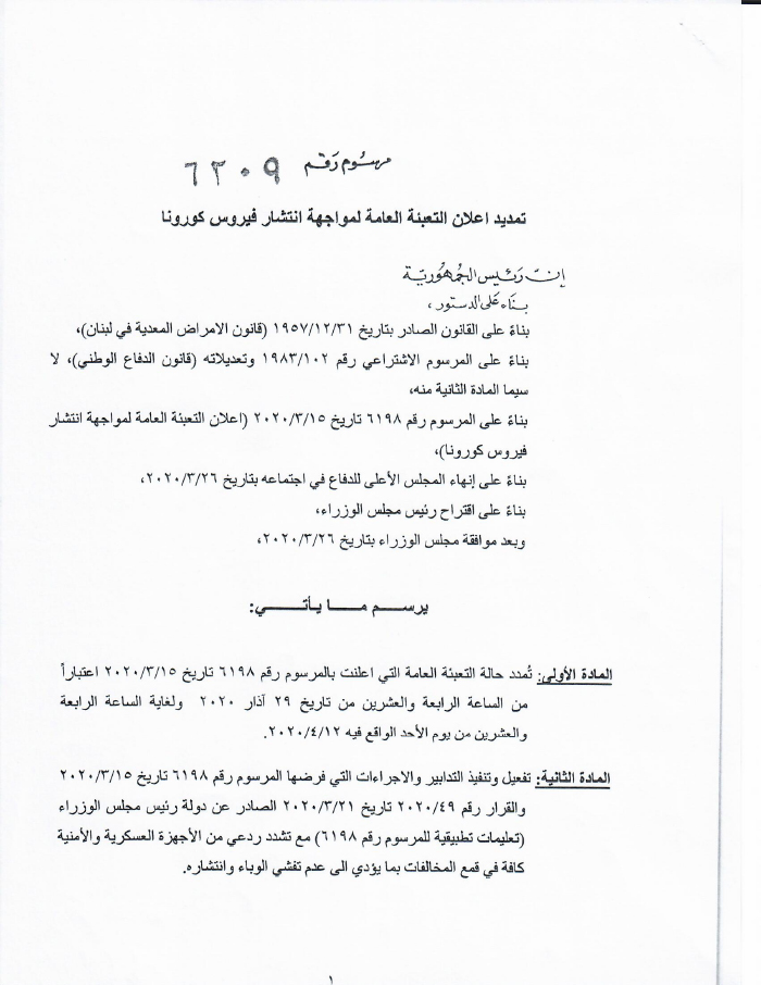 - استمع مجلس الوزراء الى عرض حول الاجراءات المتخذة في اطار حالة التعبئة العامة. واقر ما أنهى به المجلس الأعلى للدفاع لجهة تمديد فترة التعبئة العامة حتى الساعة 24 من يوم 12 نيسان المقبل. كذلك تأكيد تفعيل التدابير المتخذة سابقا، لا سيما في موضوع التنقل والانتقال، مع تشدد ردعي من الأجهزة العسكرية والأمنية، تفاديا لحالات التفلت التي حصلت في الاسبوعين الماضيين.