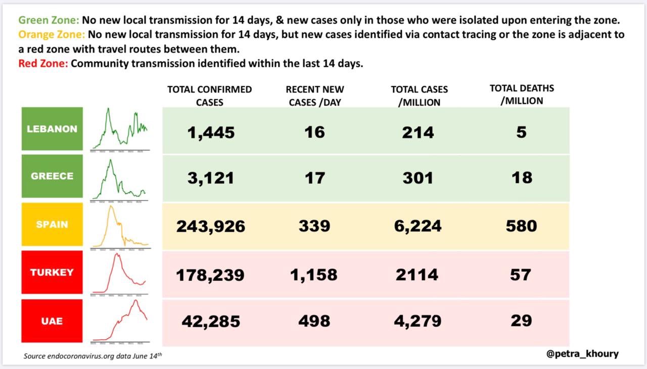نشرت مستشارة رئيس الحكومة للشؤون الصحية بيترا خوري عبر "تويتر" انفوغرافيك يُظهر تصدّر لبنان في مجال مكافحة فيروس "كورونا" مقارنة بالقوى العظمى في العالم.