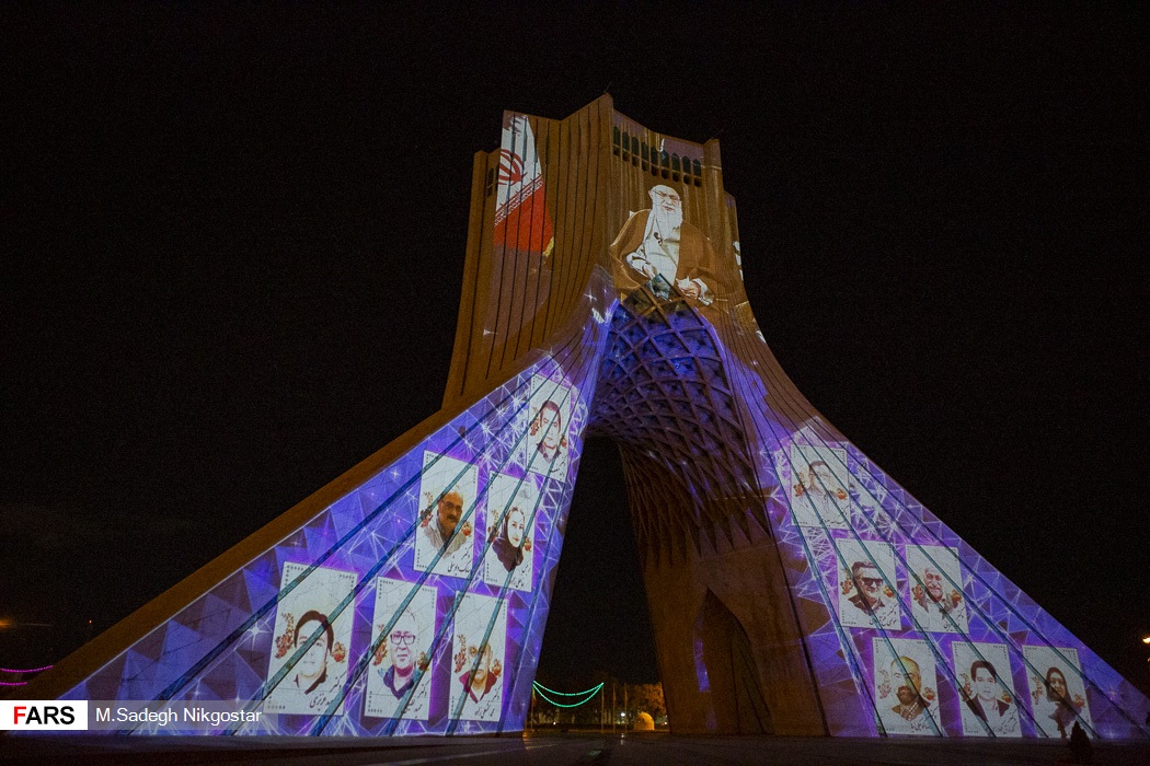 وعرضت طهران صورا لضحايا كورونا من الإيرانيين بين الكوارد الطبية، ومقاطع لكلمات اية الله العظمى الإمام الخامئني.